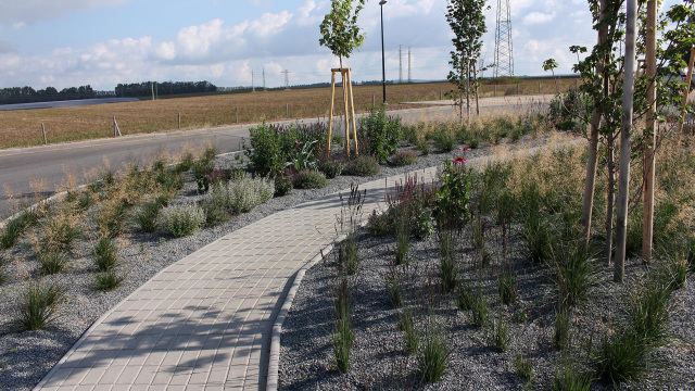 Realizace štěrkového trvalkového záhonu v areálu společnosti ve Svitavách.